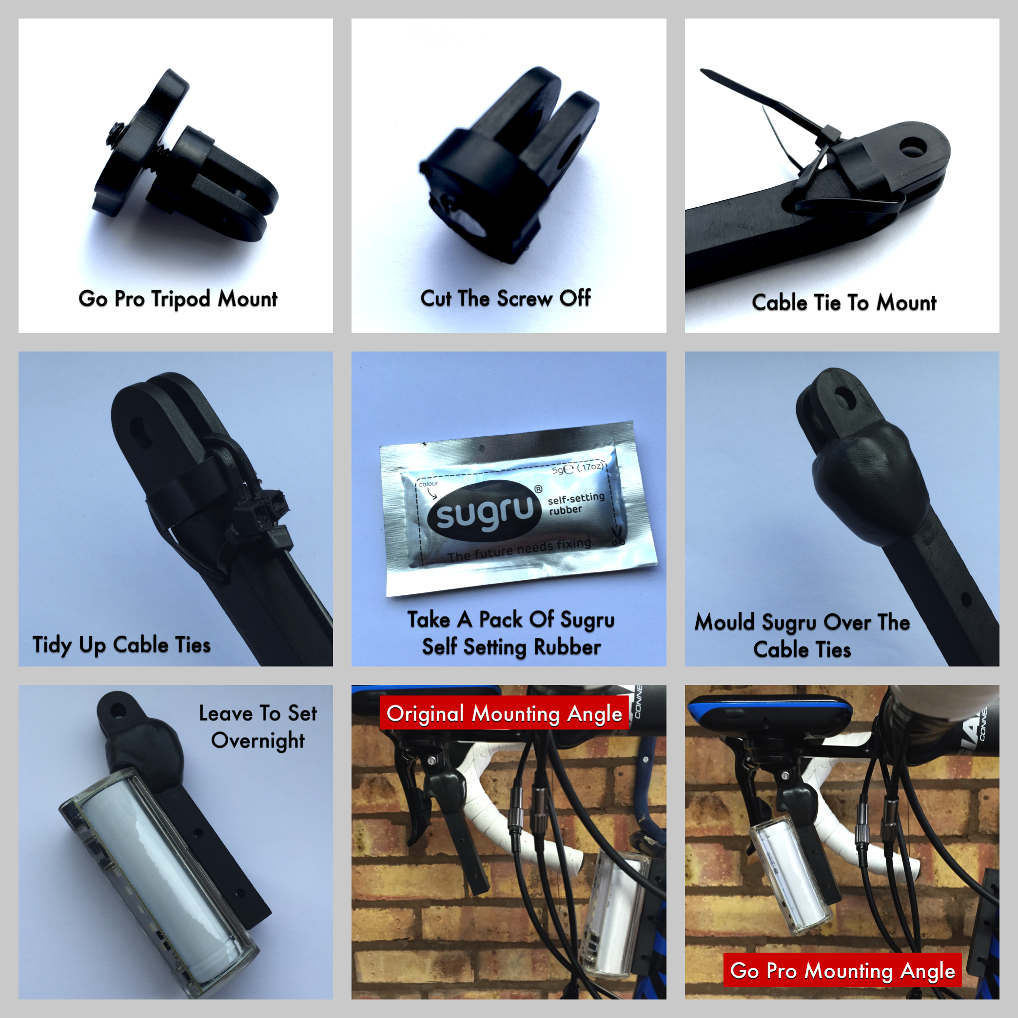 I made the new mount for the front flare by joining a go pro tripod adapter to the top of the supplied Orfos magnet with cable ties and Sugru to make a secure and durable connection. It withstands vibrations whilst out on the road and is strong enough that you can still pull the flare off the magnet. Total cost of the mount about £4 in parts and 30 minutes to put to together.